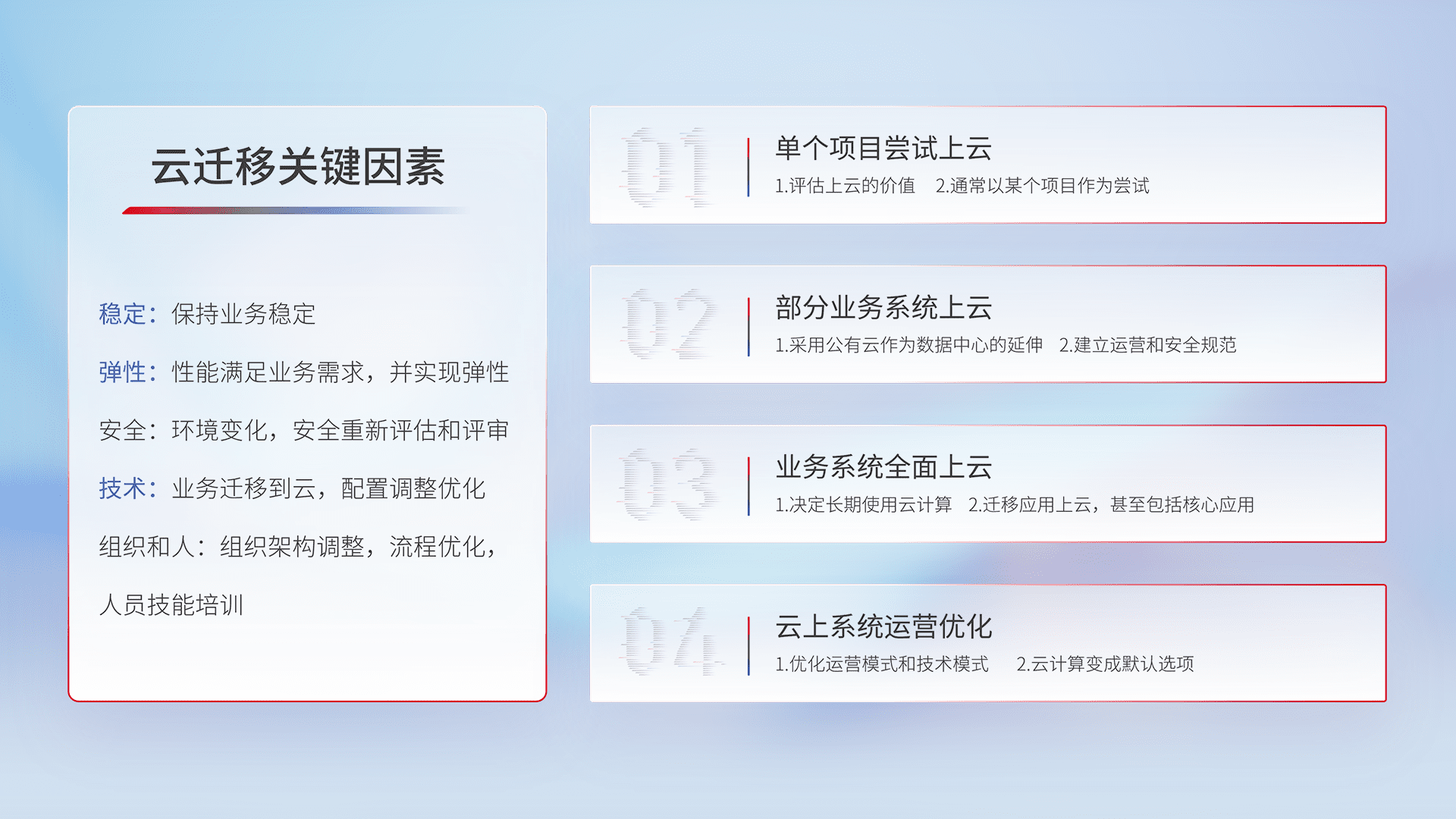 结合实际业务,,从规划设计、、、云平台选型、、云原生改造、、、数据迁移、、、、集成交付,,迁移全过程为客户识别最佳上云路径,,,做好风险识别管理,,设计网络架构、、身份权限、、、安全审计合规、、、、操作审计、、、日志审计、、、监控告警策略、、、、多站点容灾设计等,,,对云上基础设施进行整体规划,,,,提升IT治理水平,,以满足弹性、、、、高可用、、、、高性能的需求。。。。