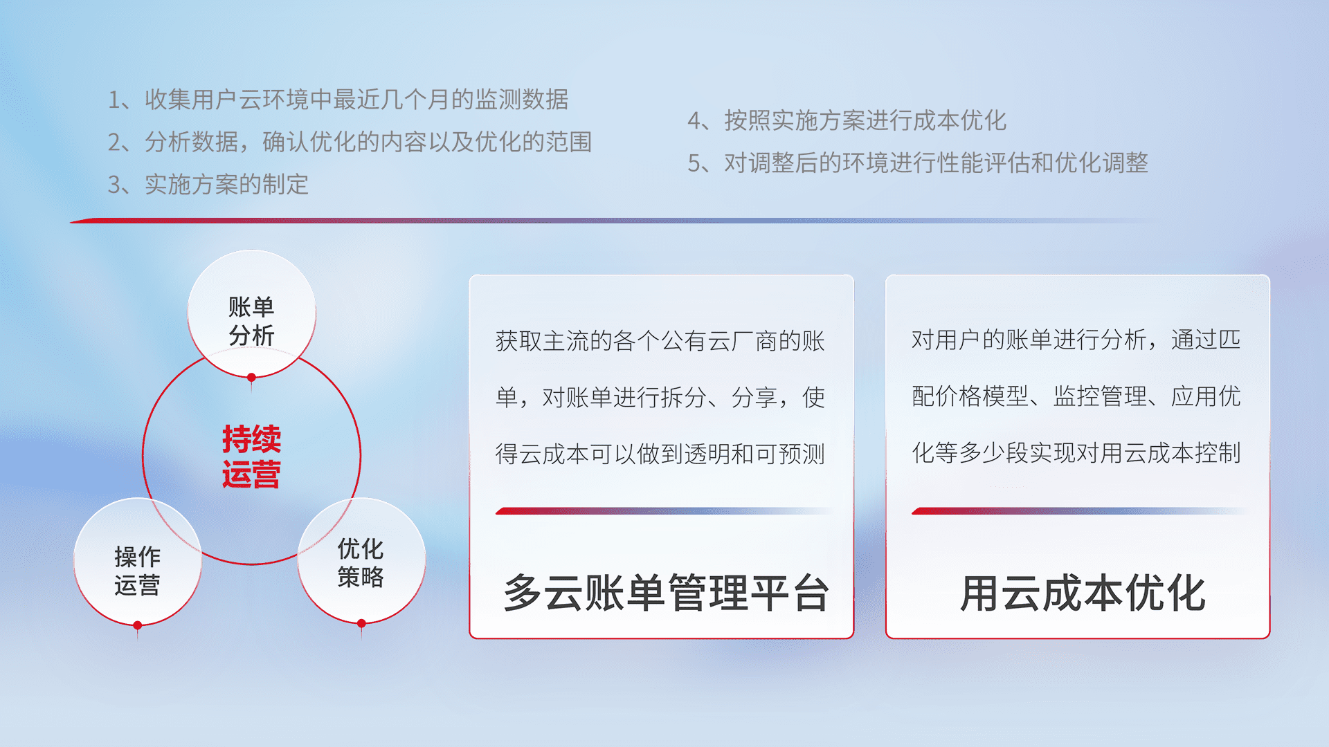 通过多云纳管,,,以统一的资源数据模型把客户的云资源进行抽象和封装,,,进而实现对多云资源的统一操作,,保障云资源管理的可靠性、、、稳定性与可用性。。。量身定制化运维内容,,,,配置、、、、开发运维、、补丁管理、、、备份、、、监控、、、认证和访问管理、、审计和日常巡检等,,,保障在用云过程中的可靠度,,稳定度以及高可用率。。