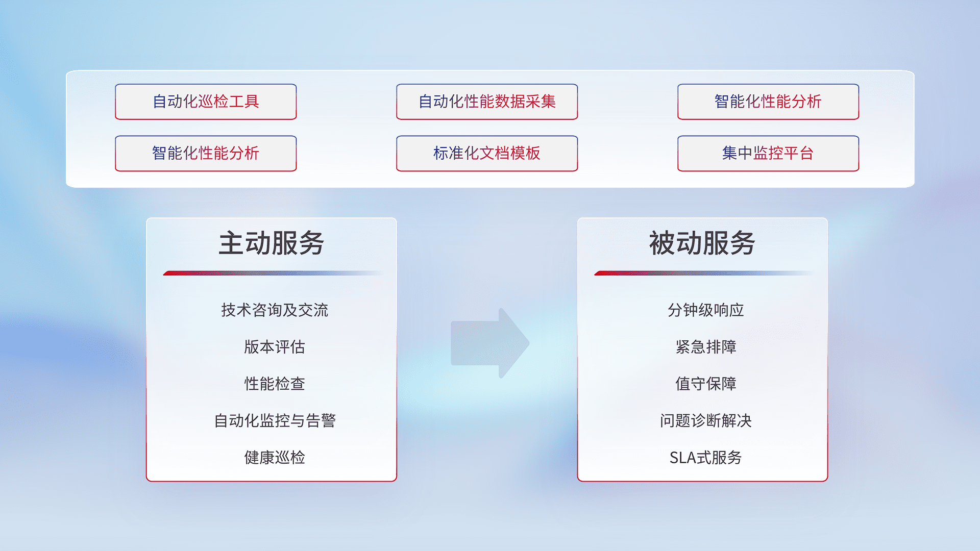 智能化工具和标准化文档,,,,保障服务质量,,,,提供主动服务(包含技术咨询、、、、版本评估、、、性能检查、、、自动化监控与告警、、、健康巡检)和被动服务包含(分钟级响应、、、紧急排障、、值守保障、、问题诊断解决、、、、SLA服务)。。。。